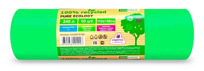 Пакеты для мусора биоразлагаемые 240 литров, 40 мкм, 10 шт. ПВД, зеленые -2 слоя, био добавка D2W - Англия, огромный размер 110х150 см