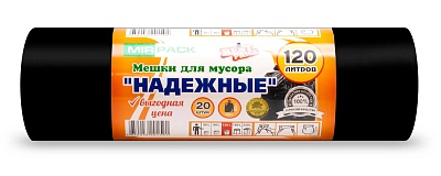 Мешки для мусора 120 литров, 30 мкм, 20 шт, ПВД, черные, 70x110 см, Надежные