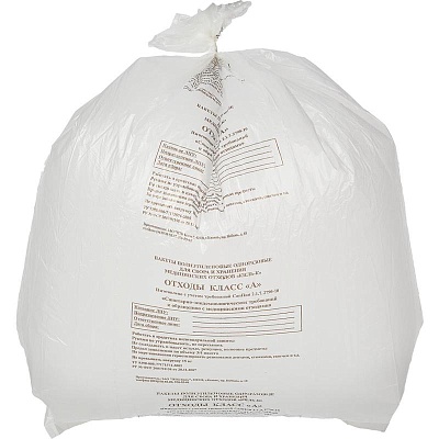 Этот пакет предназначен для утилизации медицинских отходов класса А. Он имеет объем 120 литров и размеры от 700 до 1100 мм.